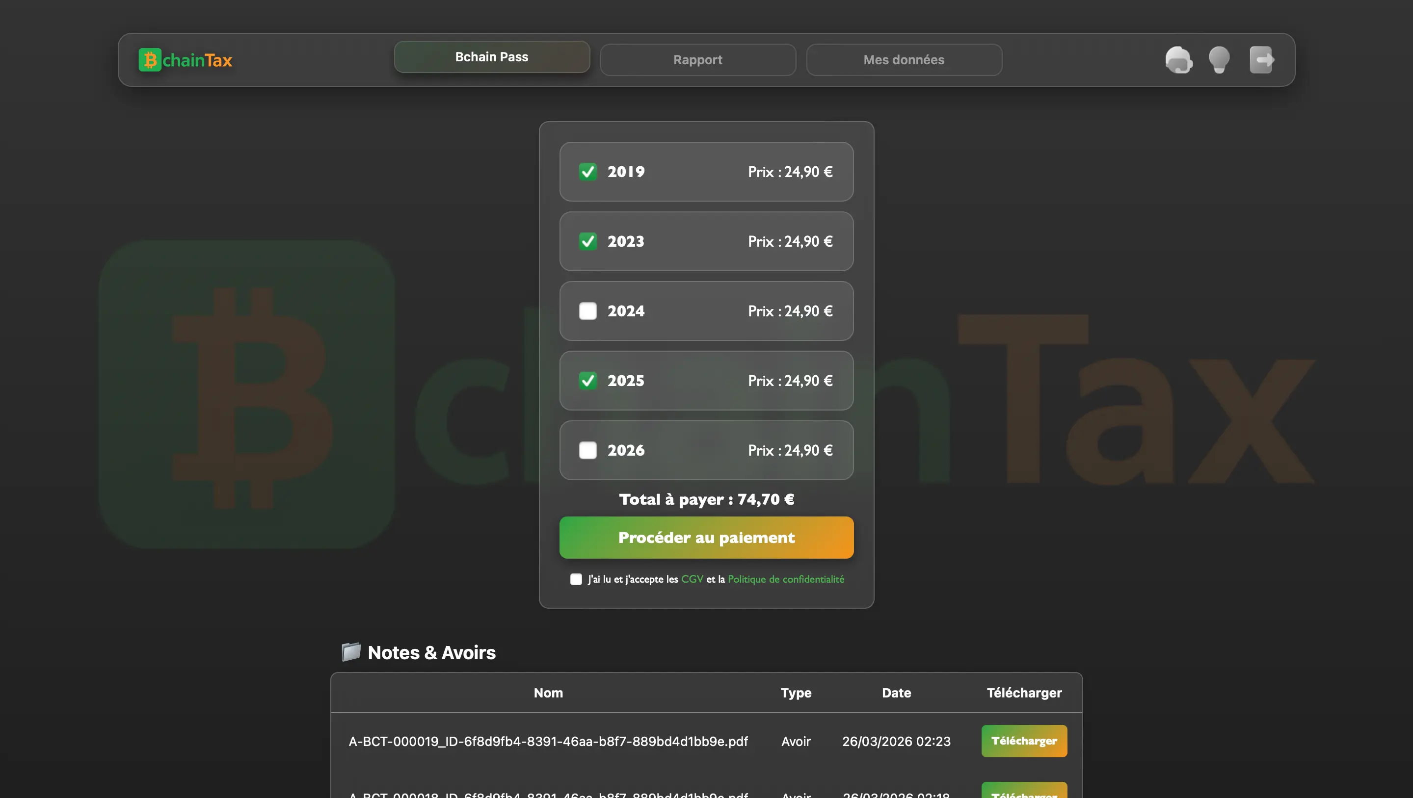 En quelques secondes, obtenez un résumé annuel clair et un détail complet de chaque opération.