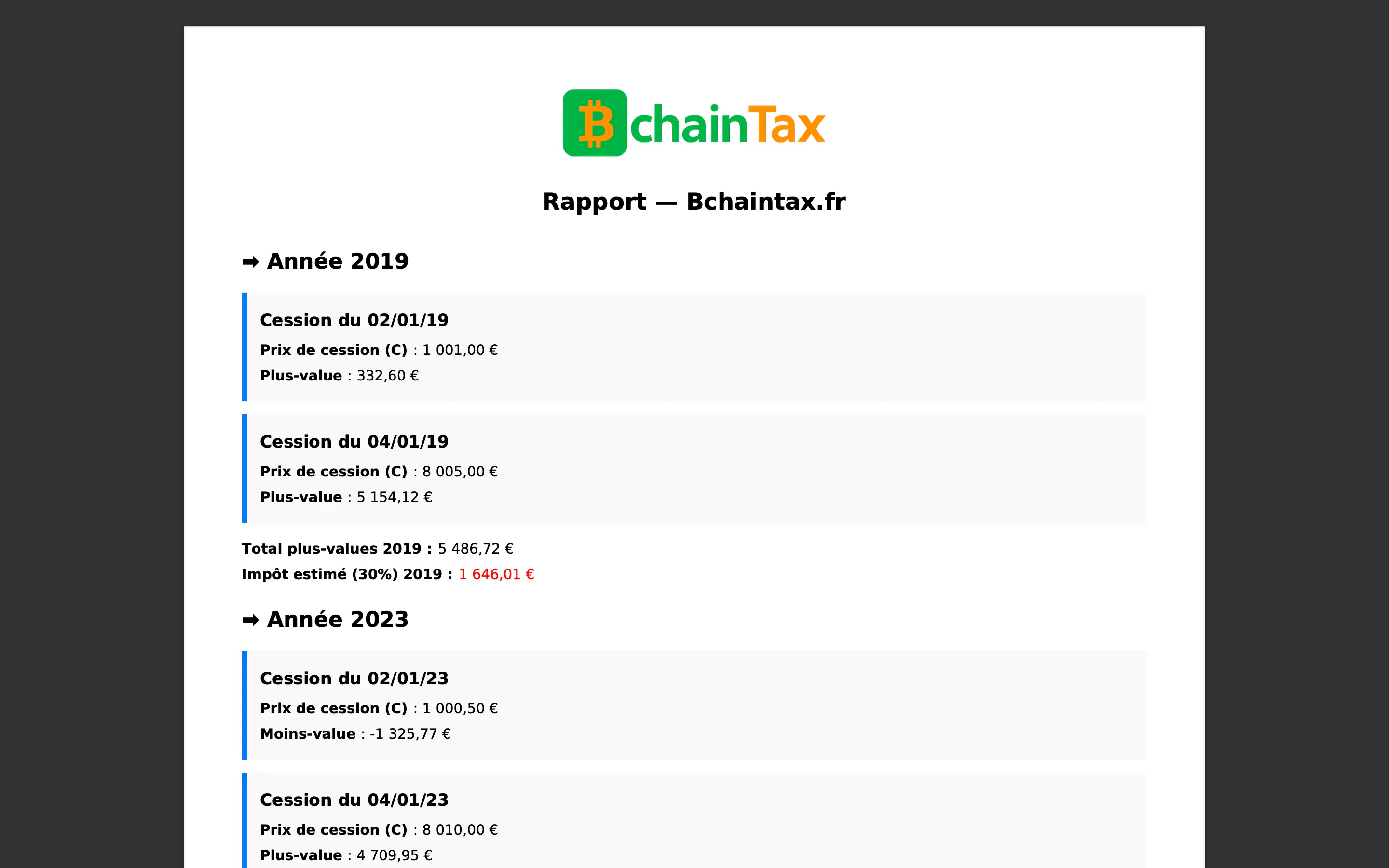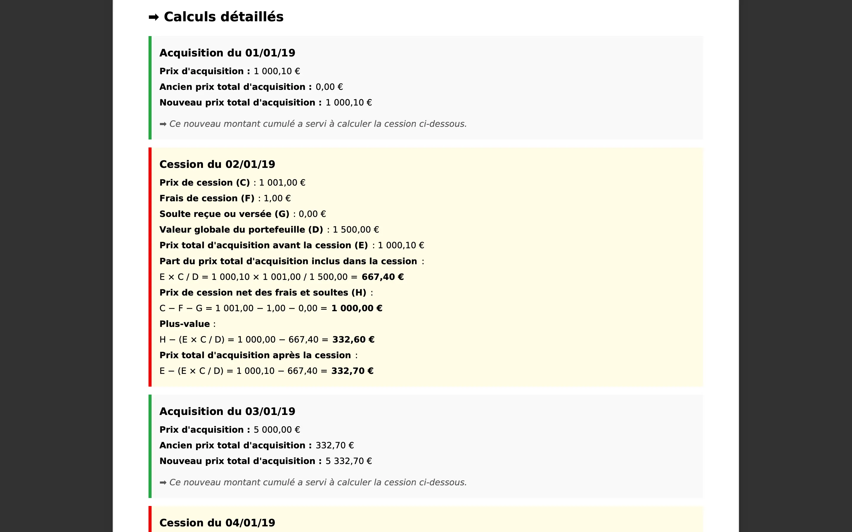 Le calcul respecte les règles fiscales françaises pour la détermination des plus-values sur cessions de crypto-actifs.
